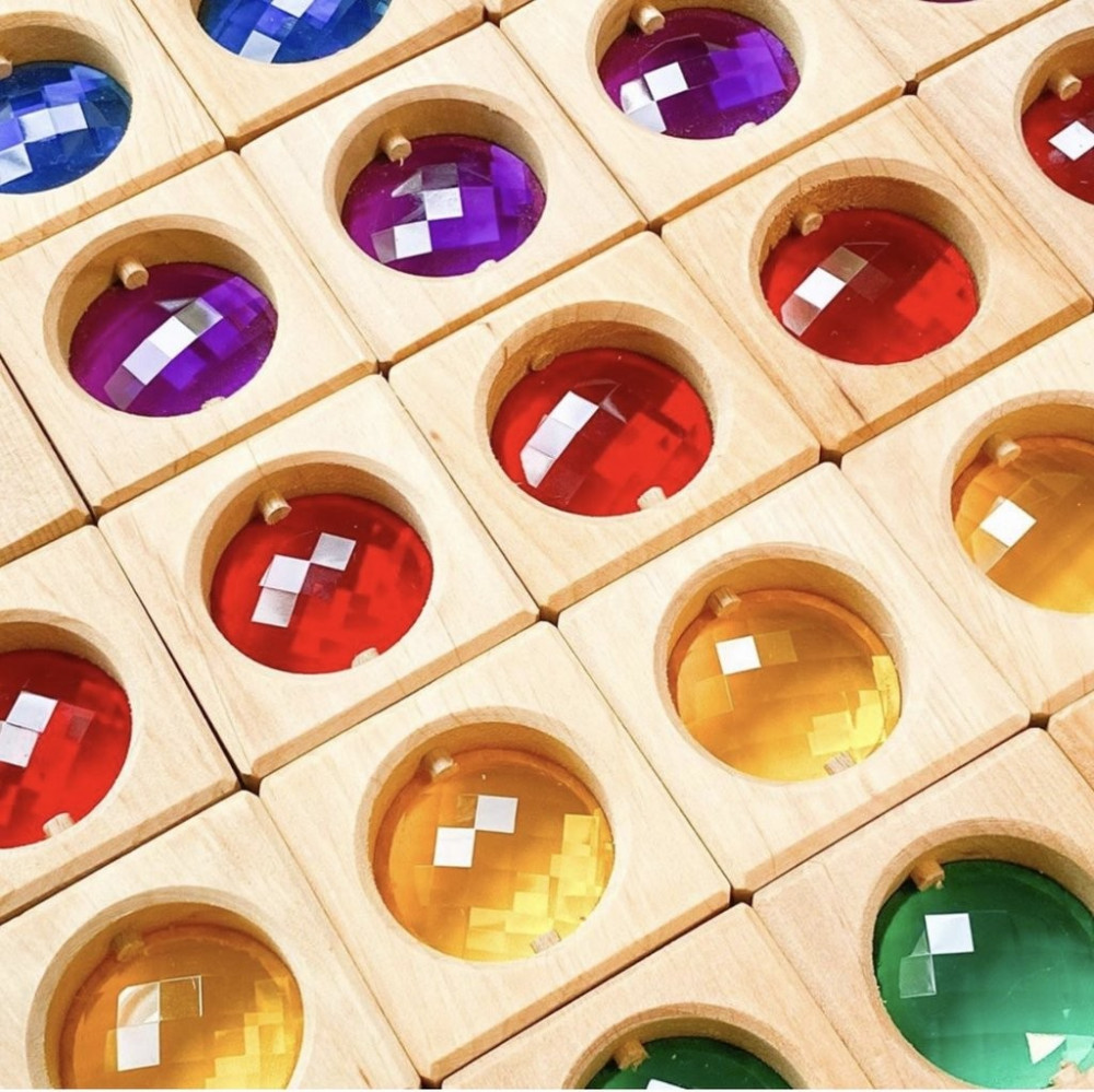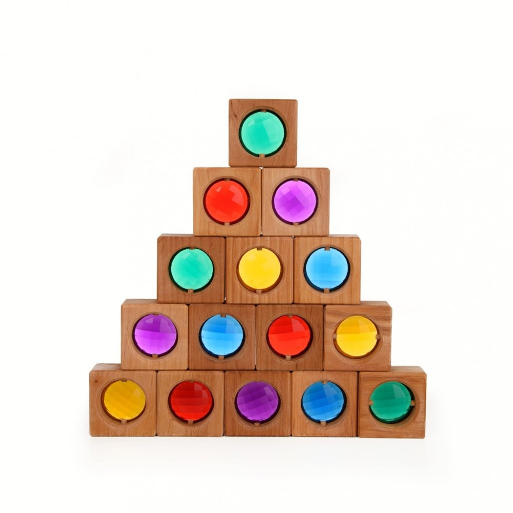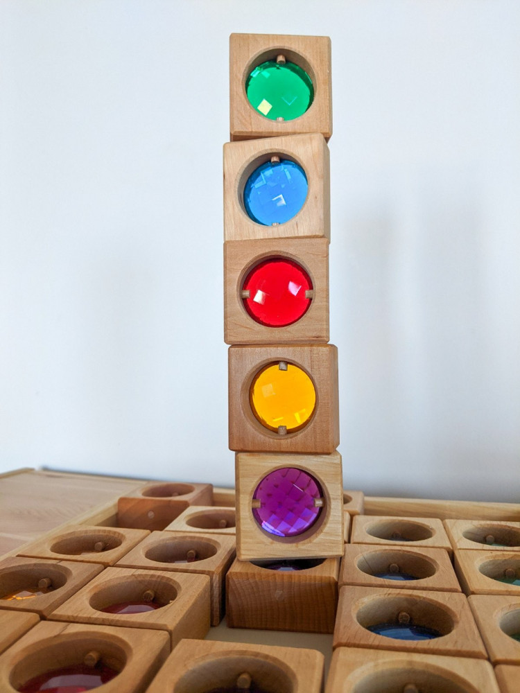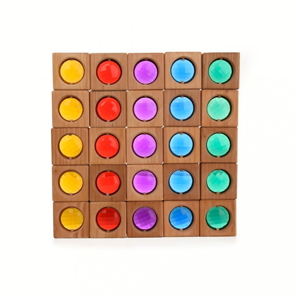 5 db építőkocka 5 féle kristállyal - sárga, piros, lila, kék, zöld színben