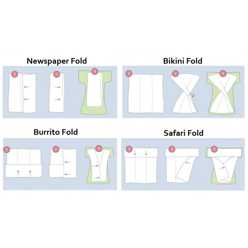 A Prefold (előre hajtogatott) pelenkákat többféleképpen hajtogathatjuk, a baba igényei szerint. Akár sima téglalapra és a pelenkakülsőbe helyezve, akár snappi csattal összefogva használható.