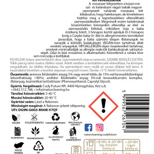 Összetevők: anionos felületaktív anyag 5% vagy ennél több, de 15%-nál kevesebb (biológiai lebonthatóság >90%), amfoter felületaktív anyag 5%- nál kevesebb, enzim komplex, illatanyag, kozmetikai tartósítószer (Phenoxyethanol, Caprylyl Glycol).