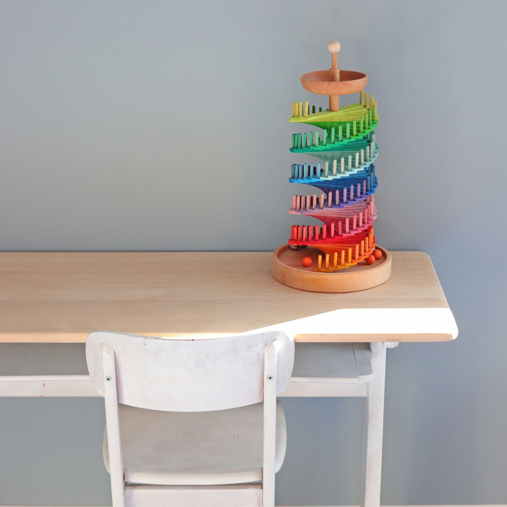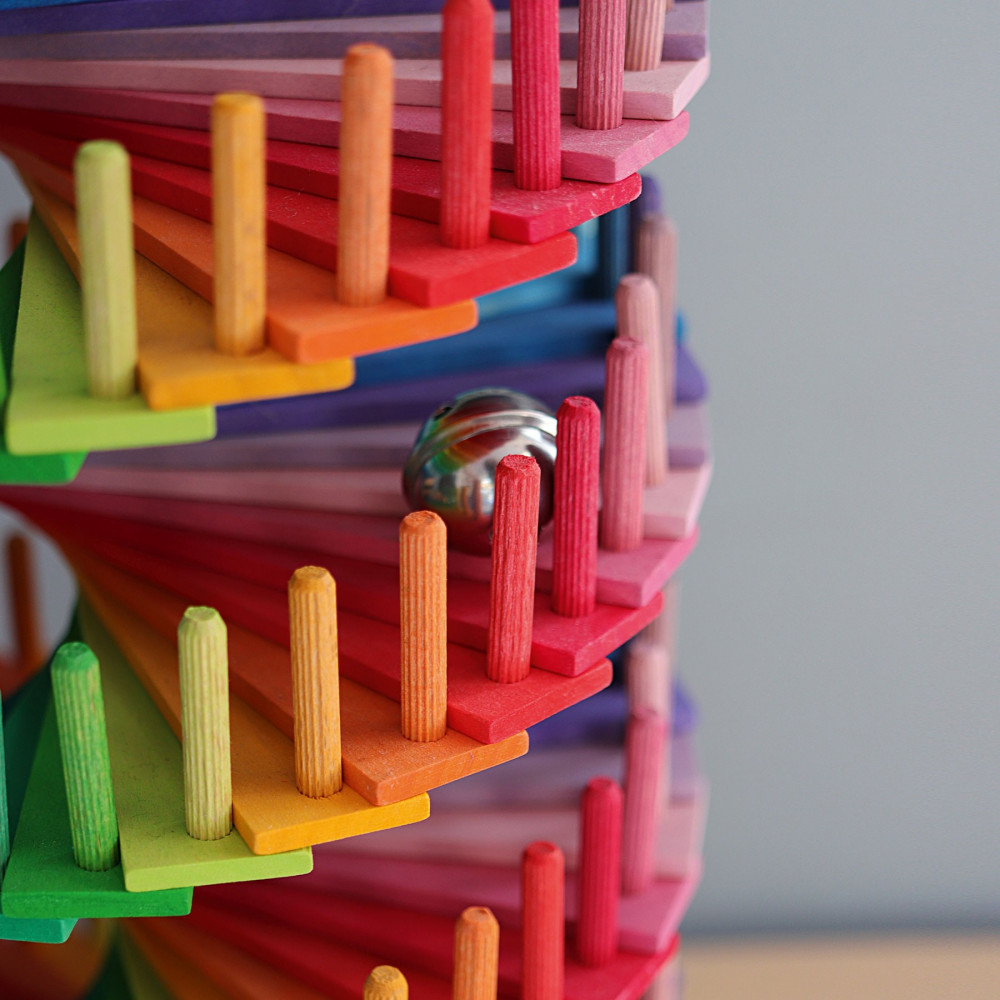 Saját ízlésetek szerint összeállítható, elképesztően impozáns spirál Grimms golyópálya. Duplasávos, így akár versenyeztetni is lehet a golyókat egymással.