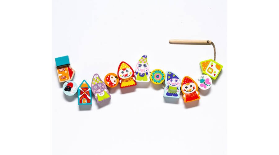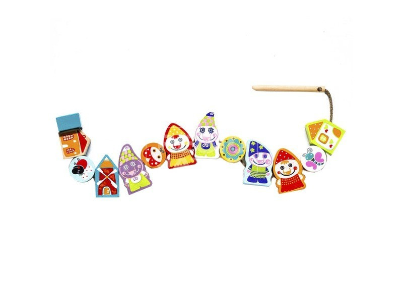 A törpés fa gyöngyfűző egy ügyességi játék, ami nagyban fejleszti a szem-kéz koordinációt, és a finom kézmozdulatokat is. A játék lényege, hogy a madzagra színes törpéket kell felfűzni, amiket utána fel is lehet akasztani, díszként lehet hasznosítani. Juharfából készült, élénk festéssel, a játék egészségre ártalmas anyagot nem tartalmaz.