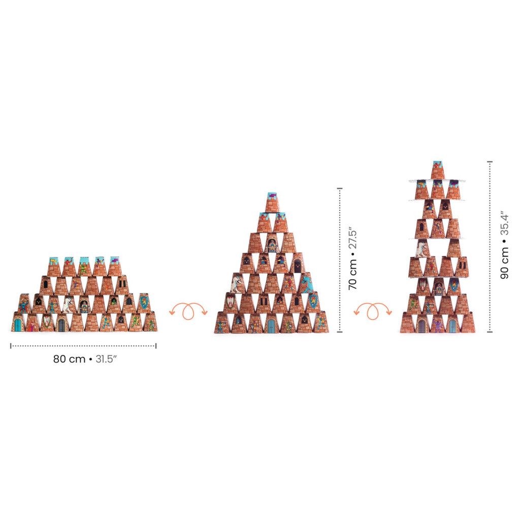 A Catle Rock egyesíti az építkezés örömét a mindent fenekestül felforgató játék izgalmával. Nagyszerű klasszikus 4-8 éves gyermekek szórakoztatására. Ez a 30 kúpból és 4 egymásra rakható deszkából álló építőjáték lehetővé teszi, hogy több tucat kombinációt alkoss a lehető legmagasabb vagy leglátványosabb kastélyokból, miközben túlszárnyalhatod magad építészként. Ha elkészül a nagy mű, itt az ideje a pusztulásnak! A játékosnak három lehetősége van, hogy dobásával mindent leromboljon. A játék rengeteg izgalmat kínál, miközben a játékosok versenyeznek, hogy akár egyetlen dobással leverjék a legtöbb kúpot. Aki eléri ezt a bravúrt, az nyeri a játékot!