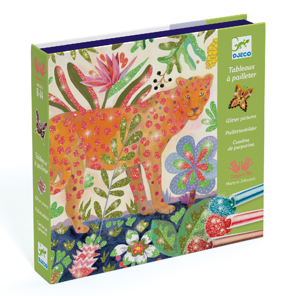 4 élénk trópusi kép, amelyeket színes mikrogolyócskákkal lehet teljessé tenni. A gyermek a kiválasztott képet a dobozba helyezi, a mellékelt eszközzel kibontja az előre felragasztott területeket, majd a füzetben megadott színkódot követve mikrogyönggyel szórja be azokat. A tevékenység végeztével a képen az állatok csillognak és szinte életre kelnek a varázslatos dekorációktól.