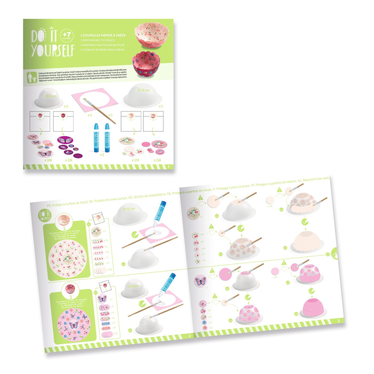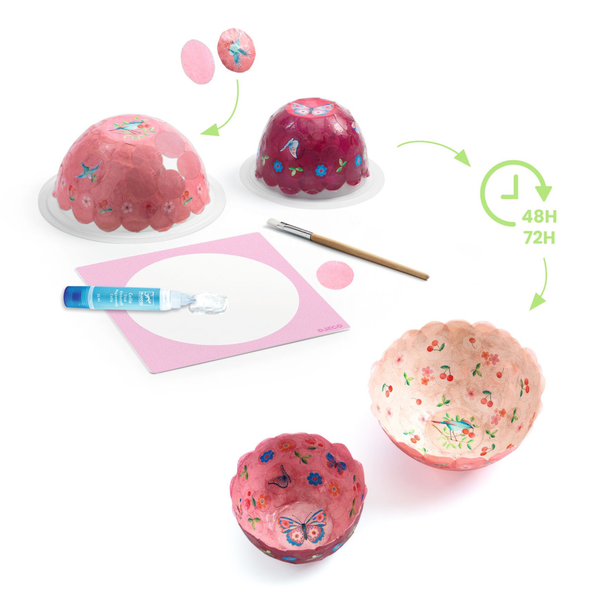 Teljes kreatív készlet két dekoratív papírtálka készítéséhez, csupán papír és ragasztó felhasználásával. A gyermek egyszerűen ragassza a nagy konfettidarabokat a formákhoz a folyékony ragasztóval, először a tál belsejére, majd a külső oldalára, hagyja megszáradni, majd vegye ki a formából. A tálkamodellek nem átlátszatlanok, mégis átláthatóak, a gyermek számára látható, hogy hova ragasztja a különböző mintás kis korongokat, és úgy építheti fel az illusztrációt, ahogyan szeretné.