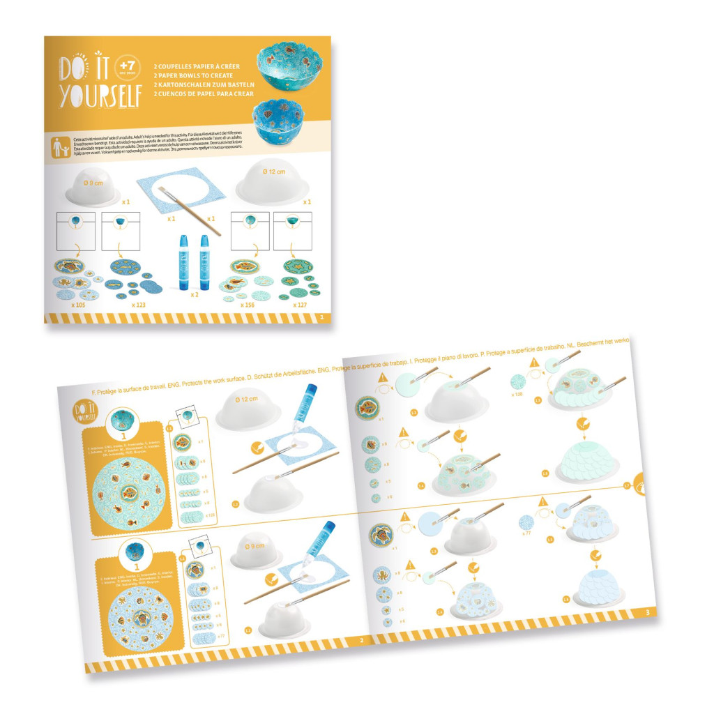 A gyermek egyszerűen ragassza a nagy konfettidarabokat a formákhoz a folyékony ragasztóval, először a tál belsejére, majd a külső oldalára, hagyja megszáradni, majd vegye ki a formából. A tálkamodellek nem átlátszatlanok, mégis átláthatóak, a gyermek számára látható, hogy hova ragasztja a különböző mintás kis korongokat, és úgy építheti fel az illusztrációt, ahogyan szeretné.