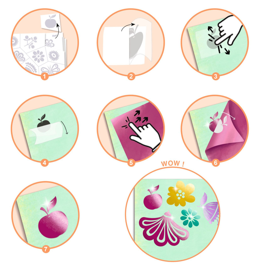 A képekre előbb az öntapadós részéket helyezzük fel, majd erre óvatosan fel kell simítani a fémfüsttel bevont fóliát. Gondosan az éleket és a sarkokat is ki kell tölteni. A megtapadt fémfüst utánozhatatlan fémhatású felülettel díszíti a képeket. A különleges színű és fényű képeket felhasználhatjuk a gyerekszoba dekorálására, vagy ajándéknak is kiváló.