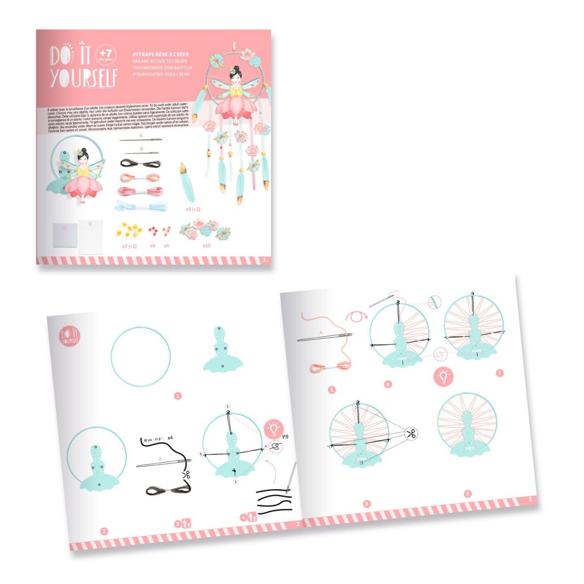Teljes kreatív készlet egy tündéri, költői álomfogó készítéséhez. A tündér kör hátterű képének színes fonalakkal, gyöngyökkel, szalagokkal, tollakkal való díszítésével lesz készen az álomfogó. Az alkotás megkönnyítése érdekében a kör hátterére már eleve rögzítve vannak a szalagok. A lépésről lépésre követhető útmutatások végigvezetik a gyermeket az alkotás minden szakaszán. Gyönyörű dekorációs tárgy készül, amely felakasztható a szobában, hogy gyönyörködjön benne a gyermek és távol tartsa a tündéri álomfogó a rossz álmokat.