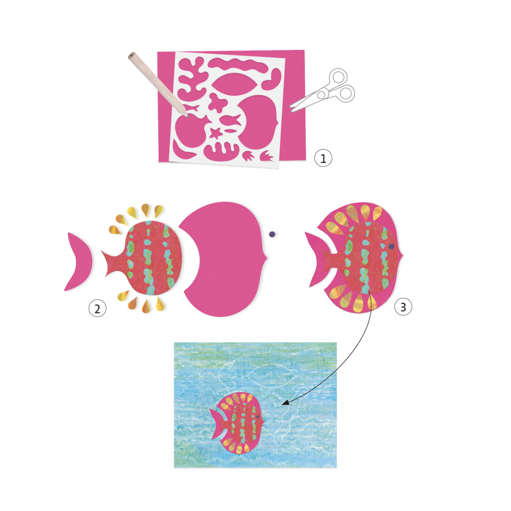 Rengeteg féle formát lehet lyukasztással létrehozni, amin átlátszik a mögötte lévő színes minta. Ebben a készletben minden adott, ami a furfangos és rendkívül dekoratív képkészítéshez kellhet.