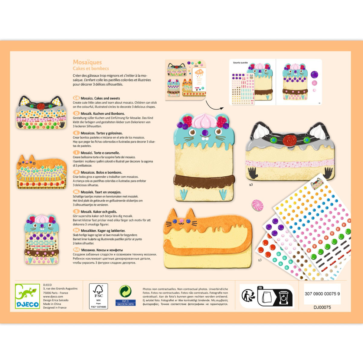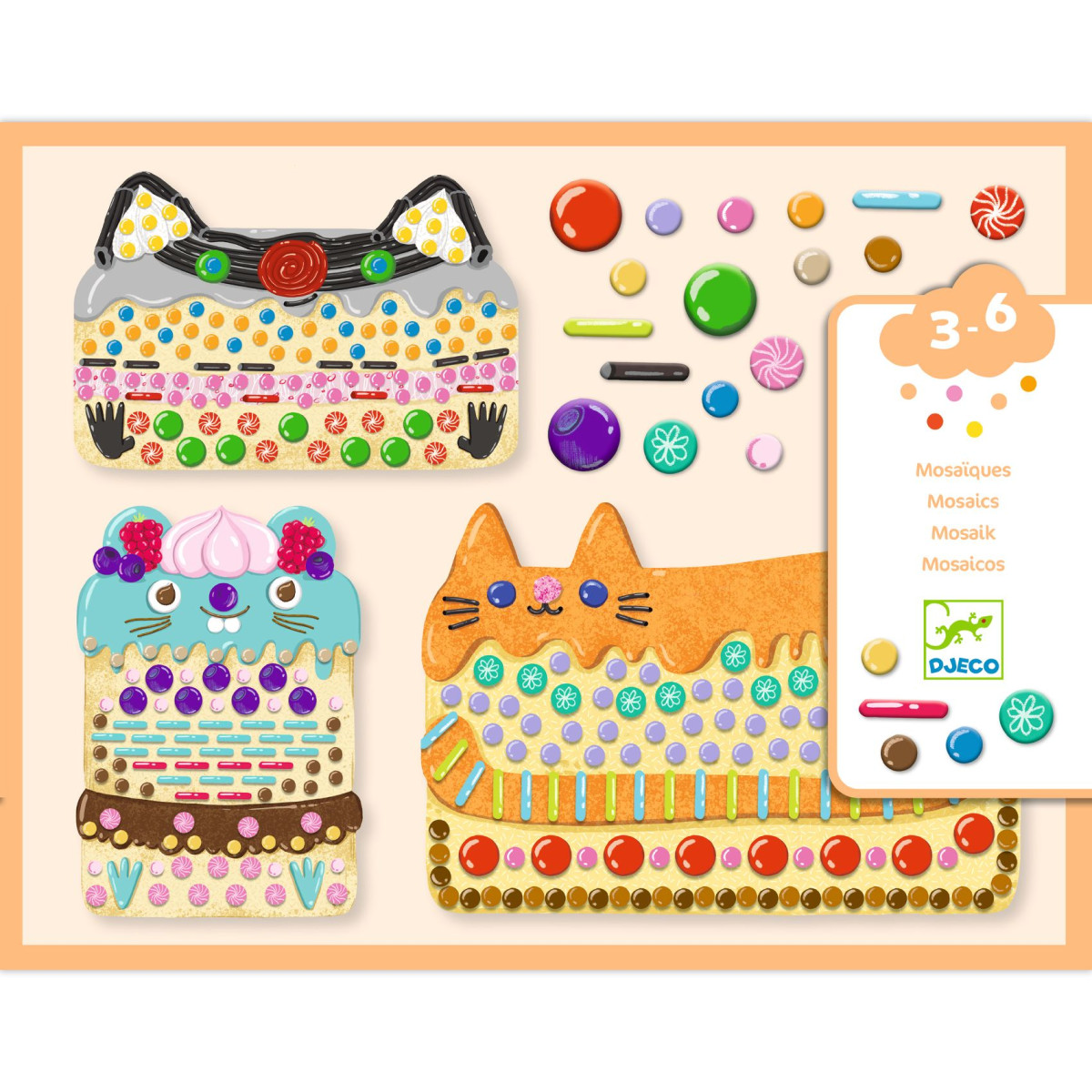 Kis készlet, nagy képekkel aranyos sütemények készítéséhez és a mozaikos díszítés megismeréséhez. A magyarázó füzetet képeit követve a gyermek a színes és illusztrált matricákkal 3 édesség sziluettet díszít fel. Vastag matricák, könnyen lehúzhatóak a kis kezek számára. Cuki figurás képek!