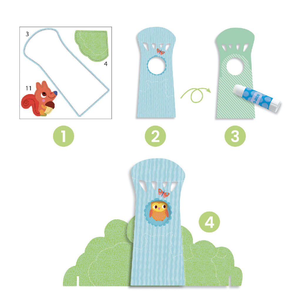 A gyermek ragasztóval ragasztja össze a lapos elemeket és rétegezéssel hozza létre a térfogatotúgy, hogy a perforált elemeket leválsztja az alapról, egymásra helyezi őket. Ragasztható részletekből áll össze az egész kép. Minden ragasztandó alakzat hátoldalán jelölés van, hogy hova ,kell tenni a ragasztót. Az elkészült alkotások dekorációnak vagy ajándéknak is kiválóak. A négy kép elkészítése minden kisebb gyermeknek szórakoztató elfoglaltság, miközben fejlődik kézügyességük. Egy kis segítő füzet is található a dobozban ami lépésről - lépésre mutatja meg nekünk a lehetséges elkészítési módokat.