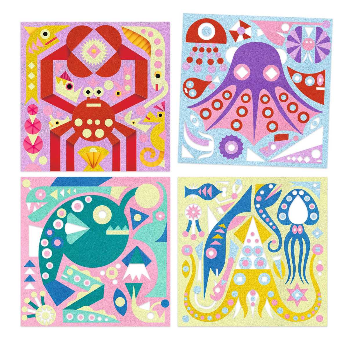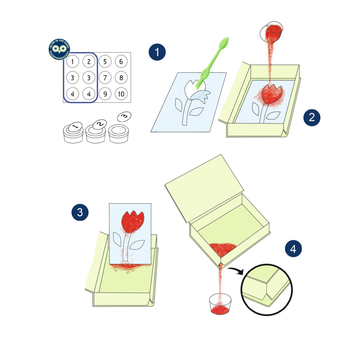 4 db festmény a víz alatti élet témájában, amelyeket színes és foszforeszkáló homokkal színeznek. A gyermek a festményét a dobozba helyezi, a mellékelt eszközzel feltárja az előre beillesztett területeket, majd a füzetben megadott színkódot követve homokkal szórja be azokat. A kész festményeket ha a gyerekszoba polcára kiteszik, lesz meglepetés az esti órákban: az illusztrációk a sötétben világítanak! A sötétben világító homoknak köszönhetően a tengeri élőlények a sötétben is láthatóak!