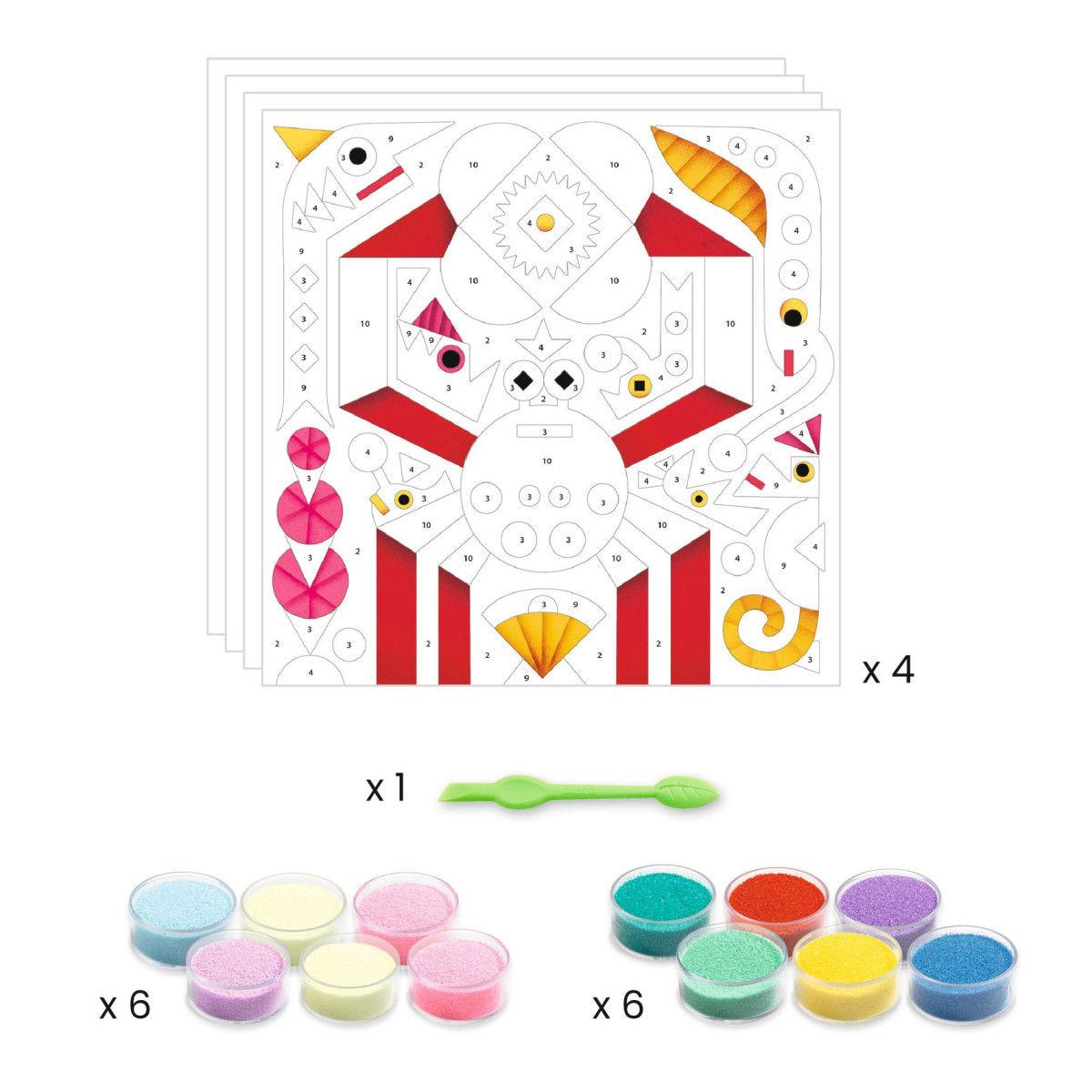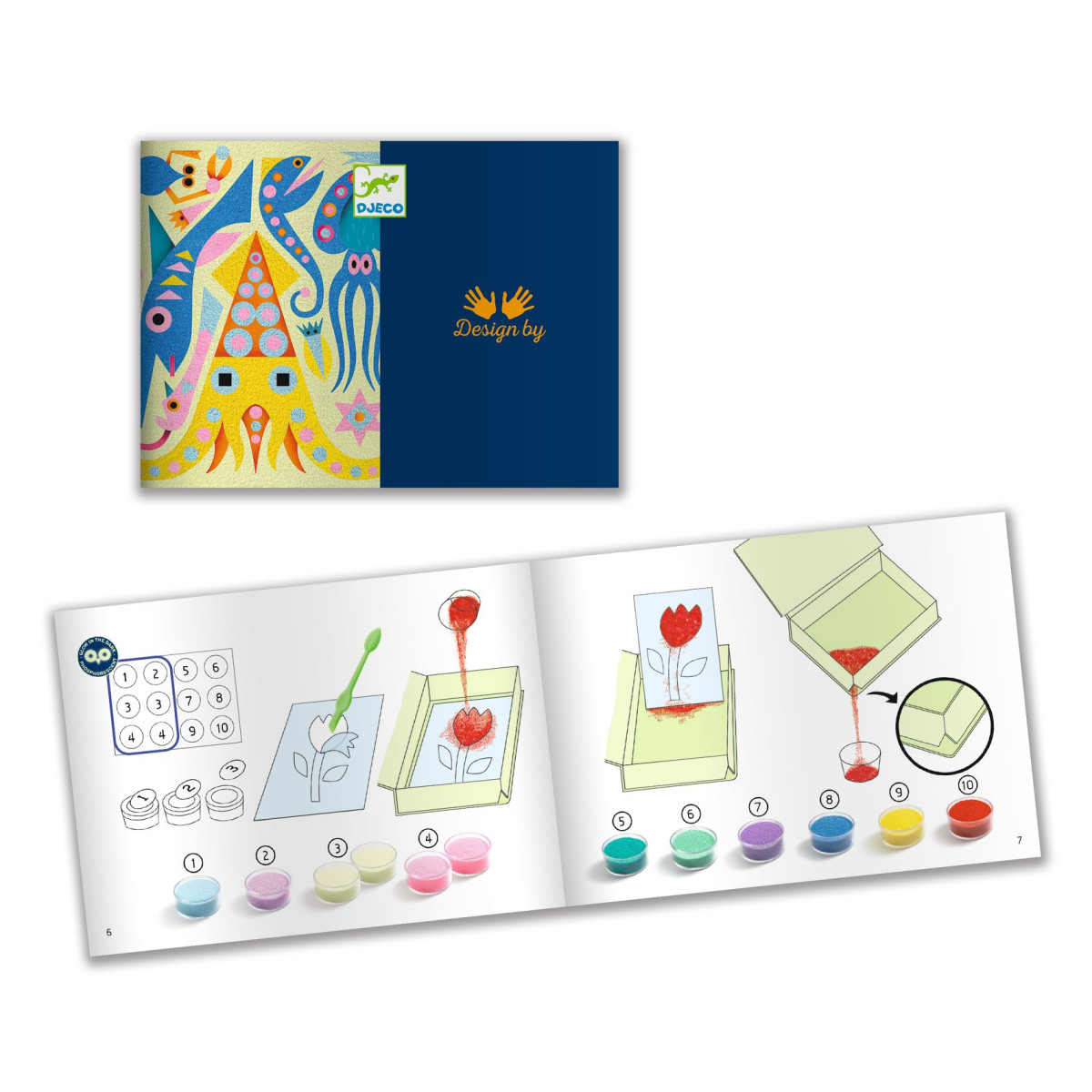 Djeco által készített, okos eszköz van a készletben a ragasztott részek egyszerű eltávolításához. Tiszta tevékenység: mert a gyermek a dobozban dolgozik, így nem szóródik szét a homok. Ez egy okos készlet, mert a dobozban van egy kis lyuk, ahol kiönthető a felesleges homok és széles szájú edényekbe önthető. Van jó tárolódoboz, rugalmas záródással az anyag tárolására, ha a tevékenység véget ért. Van egy magyarázó füzet, amely lépésről lépésre részletezi a hogyan lehet a homokképet készíteni.
