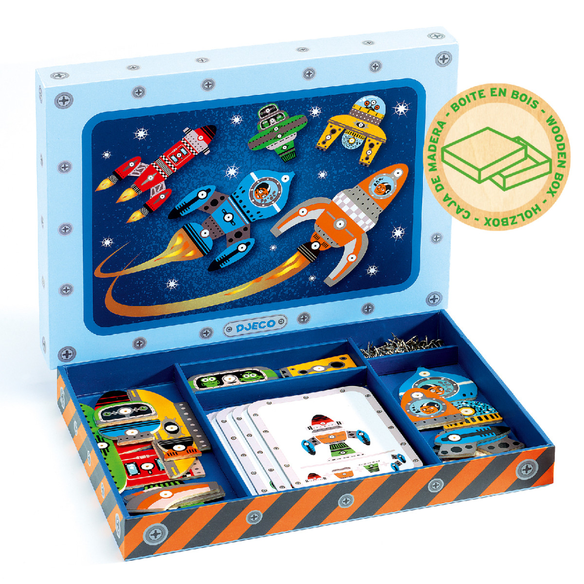 A montázs készítés az ovodás korú gyermekek egyik kedvenc fogalatossága. A meglévő elemek, anyagok, formák rögzítése egy adott alapon már a legkisebbeknek is sikerélményt nyújt. A montázs technika új mozanata a Djeco képkirakó, alkotó játékában a kapcsokkal, vagy pici csavarral, életlen szögecsekkel való képrészek rögzítése. Az űrhajó, űrsikló koppintós képépítő , montázs alkotó játék szögecsekkel rögzíti a parafa alaphoz a kép alkotóelemeit. Az alkotóelemek, űrhajók, űrsiklók részei, festett fafigurák, amelyek a megfelelő helyen vannak átlyuggatva a rögzítéshez. A gyermek választhat a hívóképek közül, építhet ugyanolyat, mint ami a képen van, de az adott elemekből kirakhatja a saját kreatív alkotását, képét is. Az elemek attól függően mozgathatóak, mozdíthatóak, milyen szorosan rögzíti a szegecsekkel a parafa alaphoz a gyermek. Önkontroll gyakorlására, rész-egész felfogás, gondolkodás és a szem-kéz koordináció fejlesztésre, új ismeretek szerzésére ad alkalmat ez a űrjárműveket megjelenítő játék.