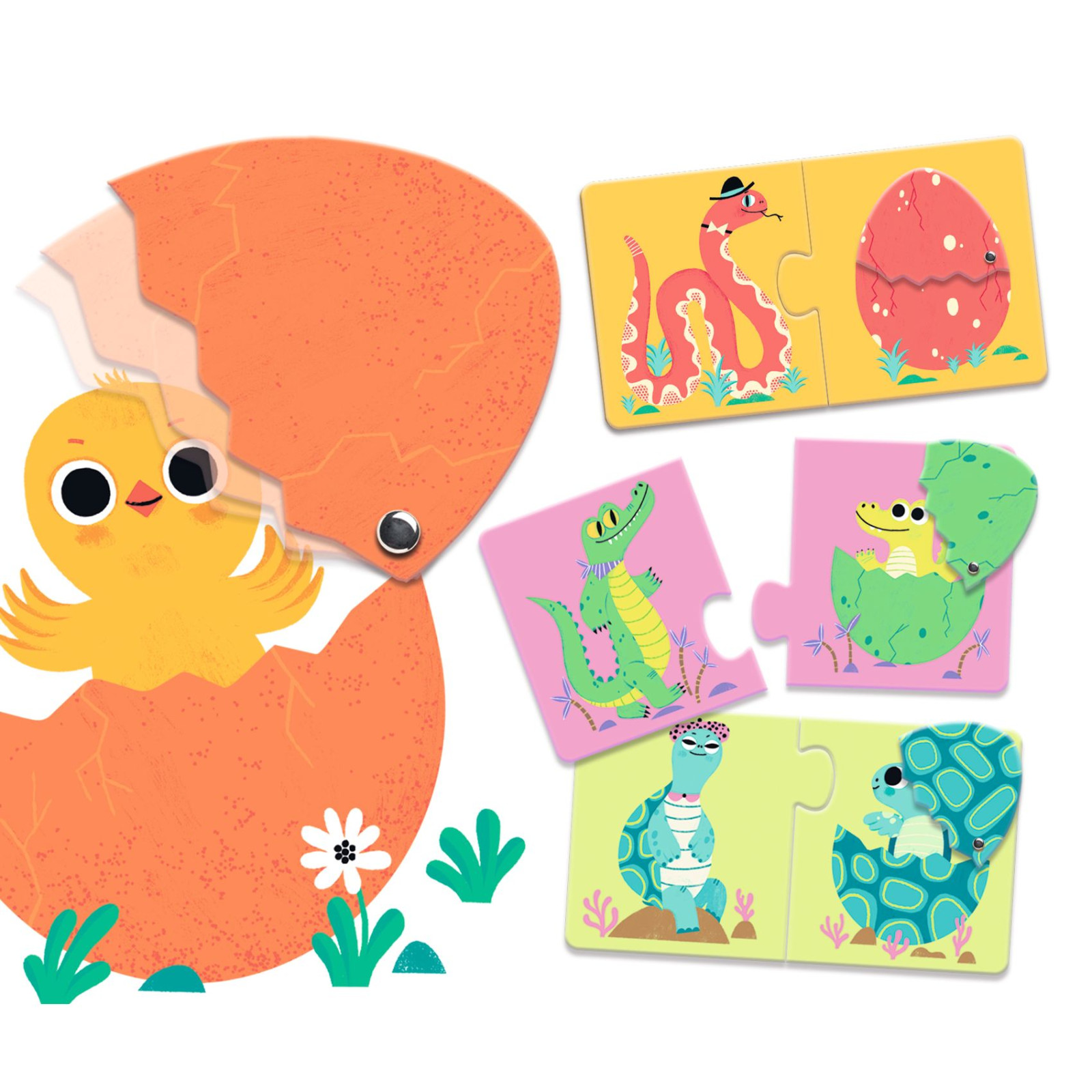 Játékra, kirakásra serkentő módon kitalált és megtervezett mini-tanulás segítő puzzle, ahol a gyermek az állatot a tojásával társítja, majd felfedezi a tojásban rejtőző fiókát. Egyszerű és szórakoztató, duó-trió képkirakós ötletek asszociációs játékai 2 éves kortól.
