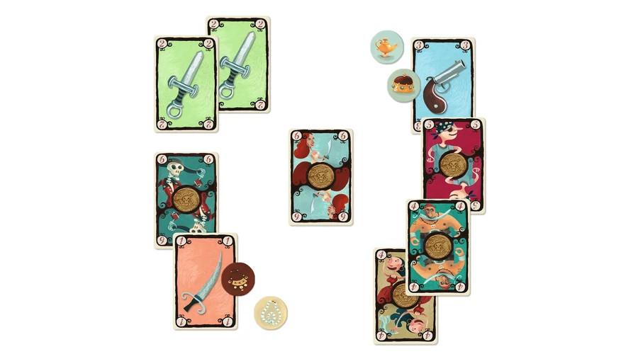 - Klasszikus kártyajáték: A hagyományos játék szabályai kacagtató kalózokkal illusztrálva, a Djeco tervezésében.