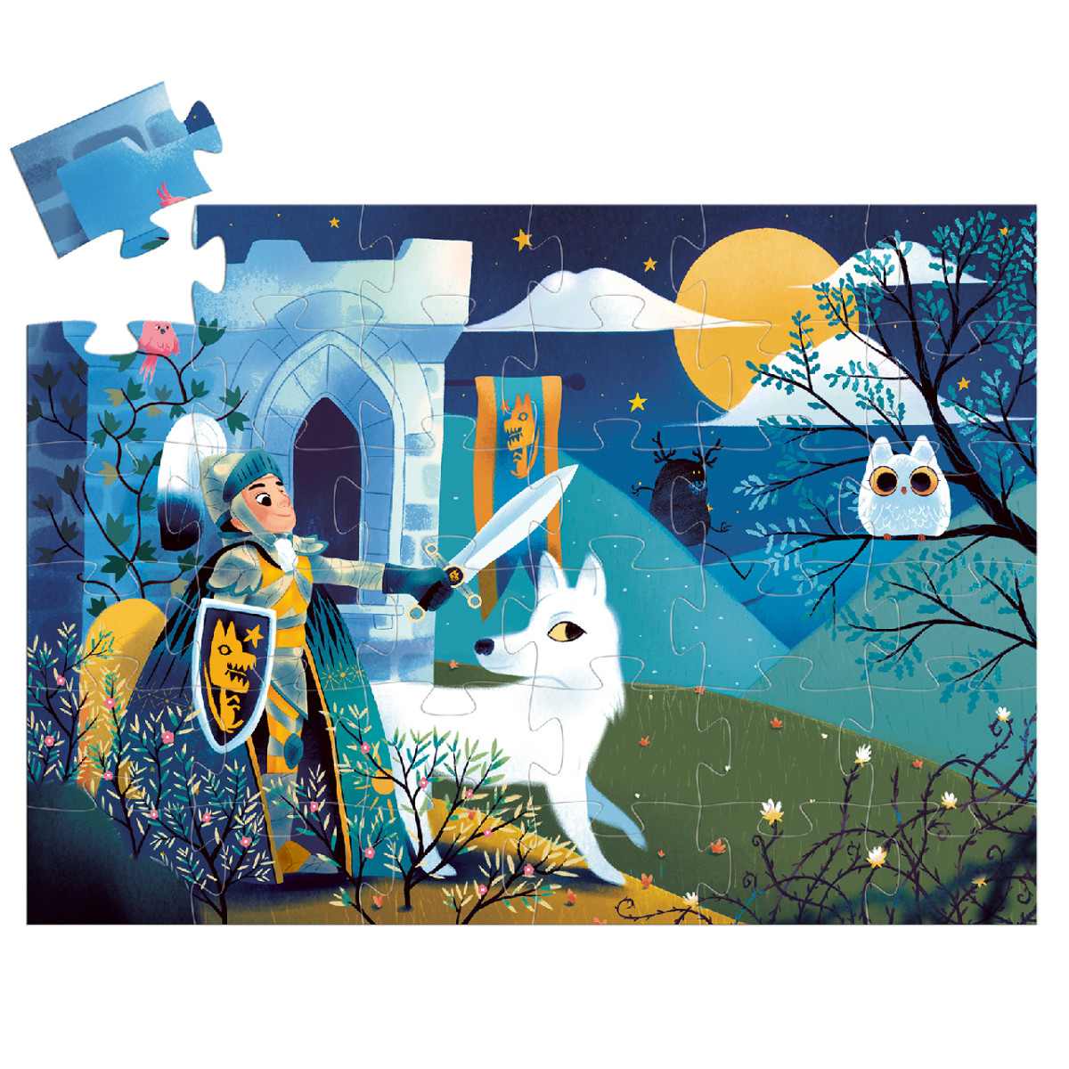 A Telihold lovagja a legenda szerint nagy harcos, a képen mellette áll fehér farkasa. A hangulatos képen a lovag éppen kilép az alkonyi ég alá a lakótornyából, vele tart hű kisérője a fehér farkas. A doboz önmagában is nagyon dekoratív dísze a játékos polcnak.