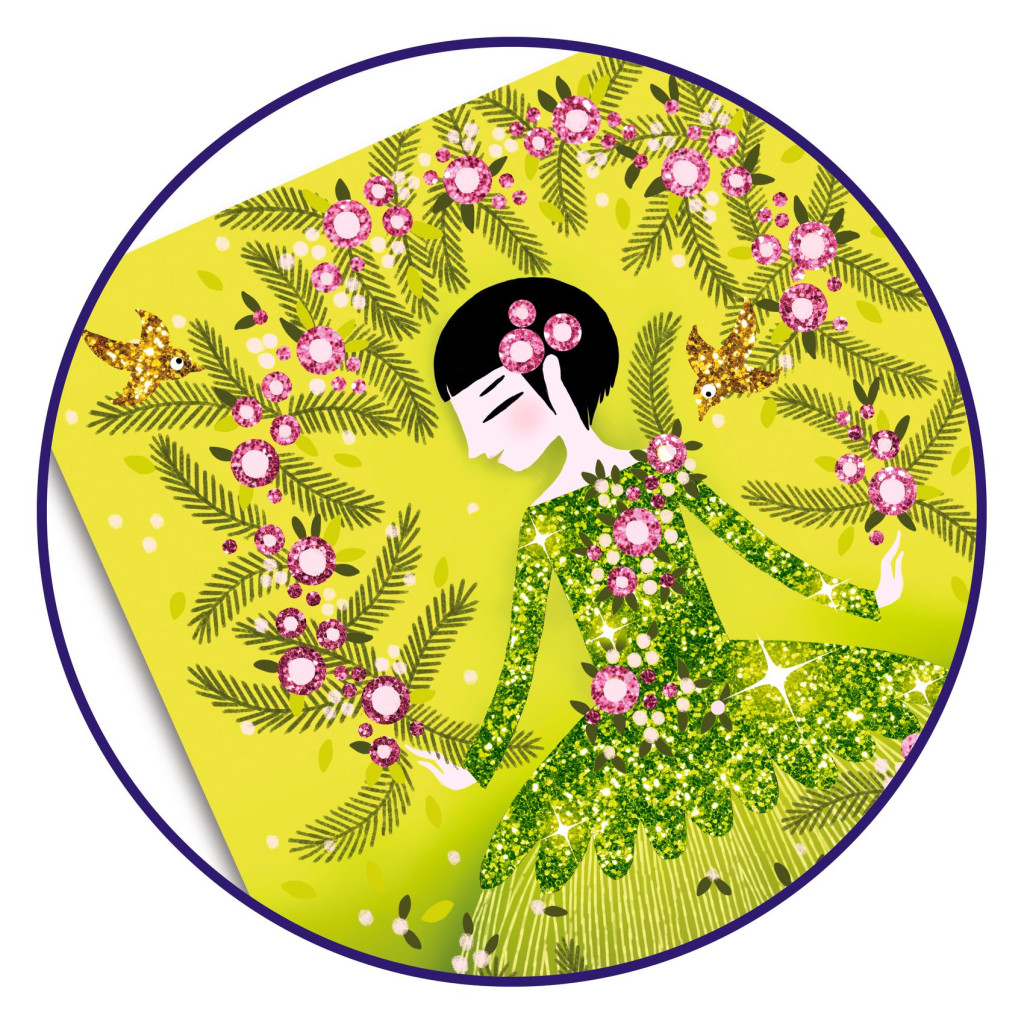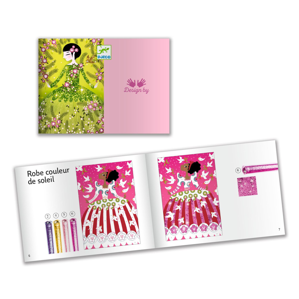 A csillogó ruhás hölgyeket ábrázoló, előrajzolt képre, amelyen számokkal van jelölve a használandó szín, a védőfóliákat leszedegetve rá kell szórni a színes homokot. A homok ráragad az öntapadó felületre, a maradékot pedig vissza lehet önteni a tégelybe a doboz segítségével. Az elkészült képek bármely szoba kellemes díszei lehetnek, de ajándéknak is tökéletesek.