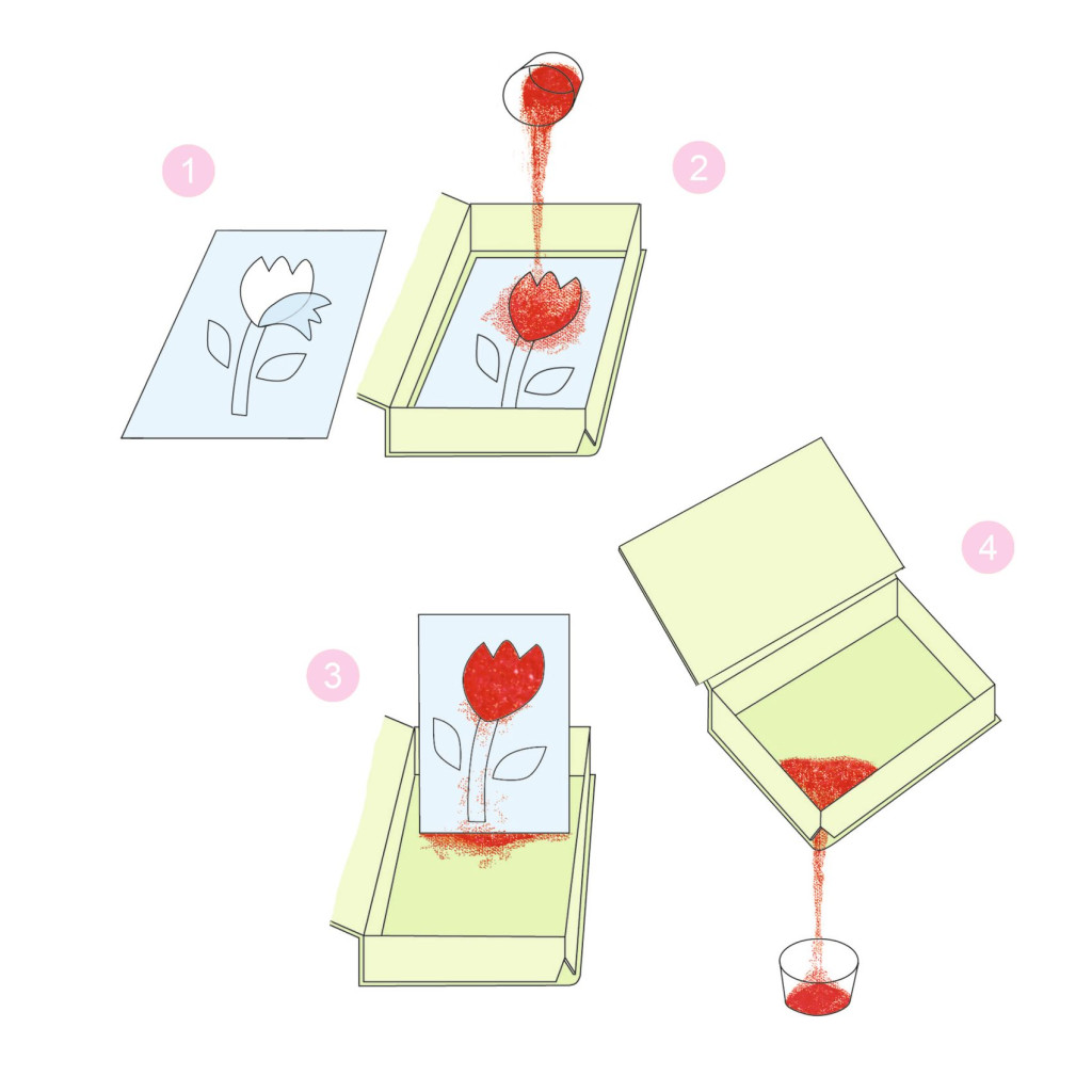 A madarakat ábrázoló, előrajzolt képre, amelyen számokkal van jelölve a használandó szín, a védőfóliákat leszedegetve rá kell szórni a színes homokot. A homok ráragad az öntapadó felületre, a maradékot pedig vissza lehet önteni a tégelybe a doboz segítségével. Az elkészült képek bármely szoba kellemes díszei lehetnek, de ajándéknak is tökéletesek.