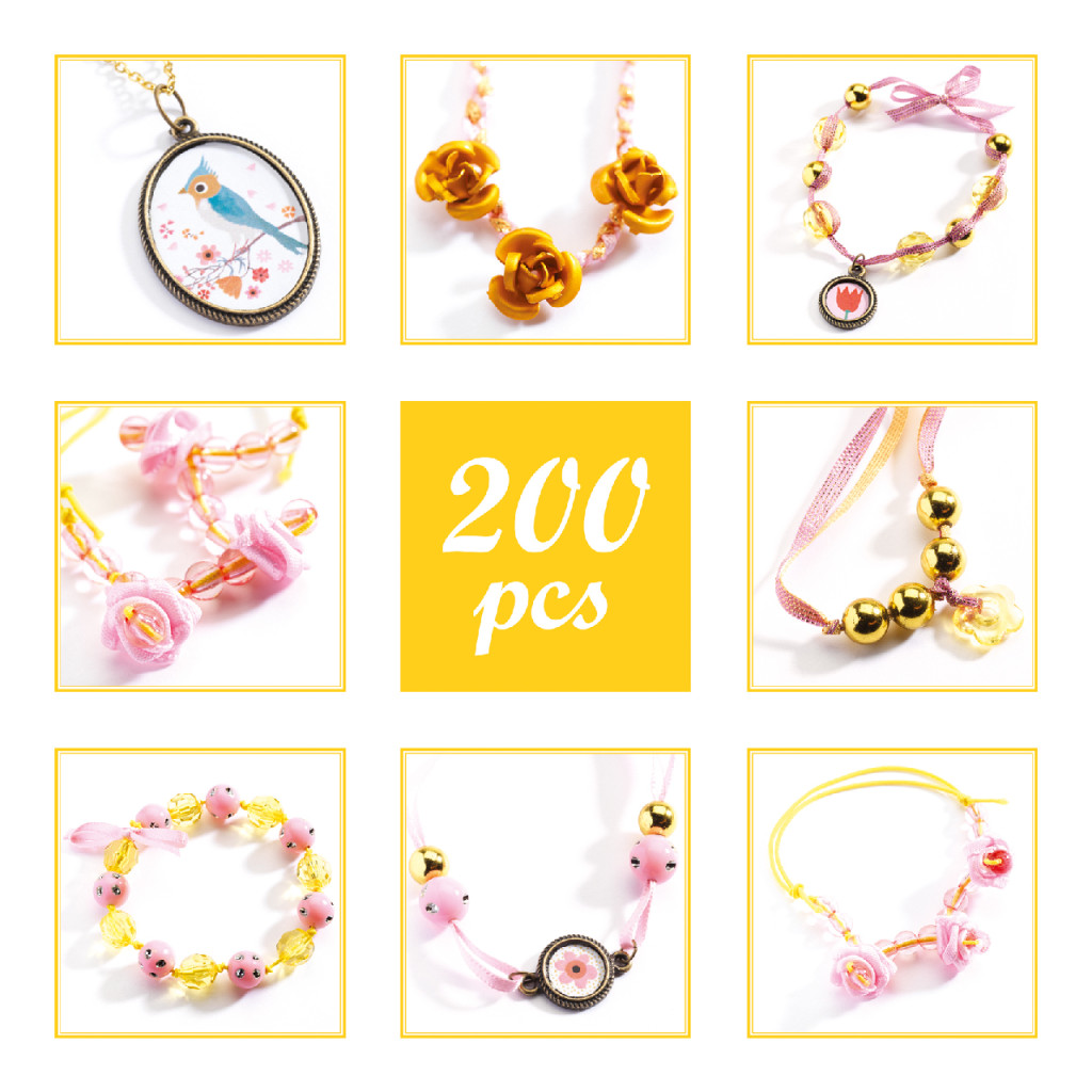 A gyöngyökből, szalagokból, stílusos, madarat és virágokat ábrázoló medálokból nyakláncok és karkötők fűzhetők, az útmutató füzet pedig megannyi színes példával ötleteket ad, inspirál.