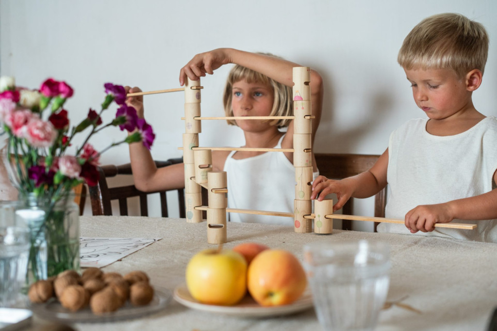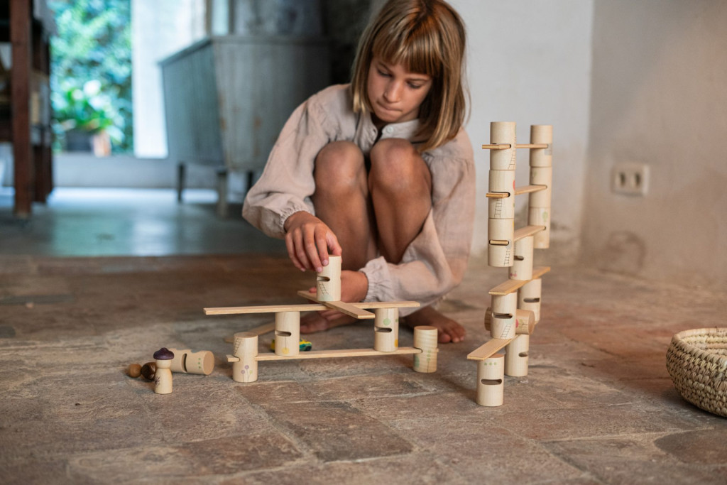 Our endless-play construction set! Build a cozy house in the forest, create a world of your own in a faraway land, or design something completely new. With these be­autifully hand-painted wooden blocks and platforms, the possibilities are limitless!