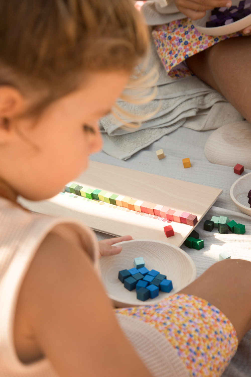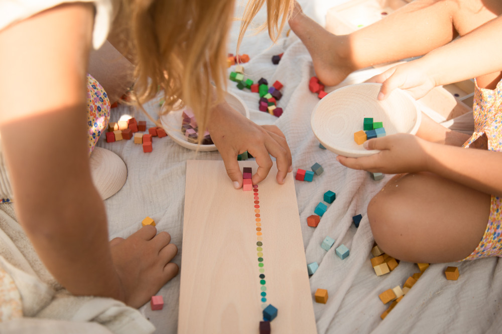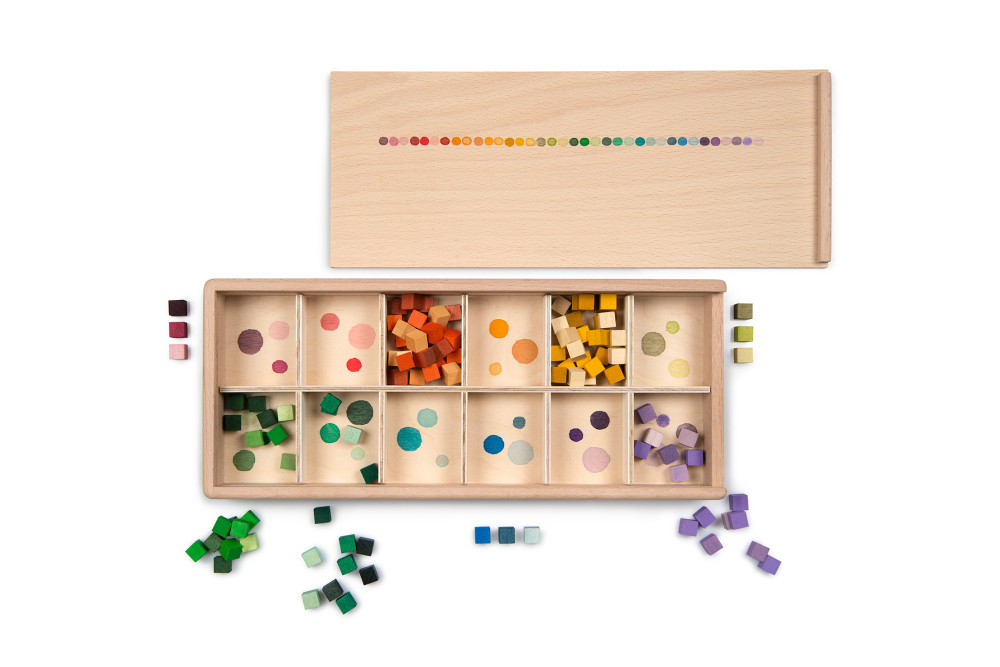 A Grapat Mis and Match fajáték szett több mint 400 kis fakockát tartalmaz a szivárvány 36 színében, egy kézzel festett fa szortírozó dobozban.