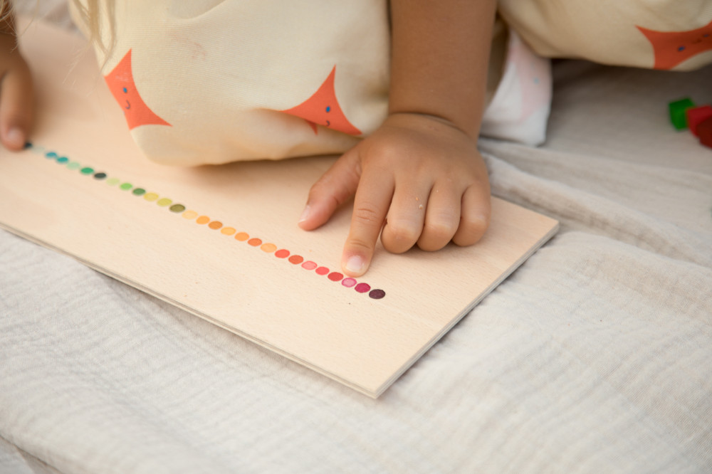 Több mint 400 kis fakockát tartalmaz a szivárvány 36 színében, színátmenetekkel, mindezt egy kézzel festett fa szortírozó dobozban.