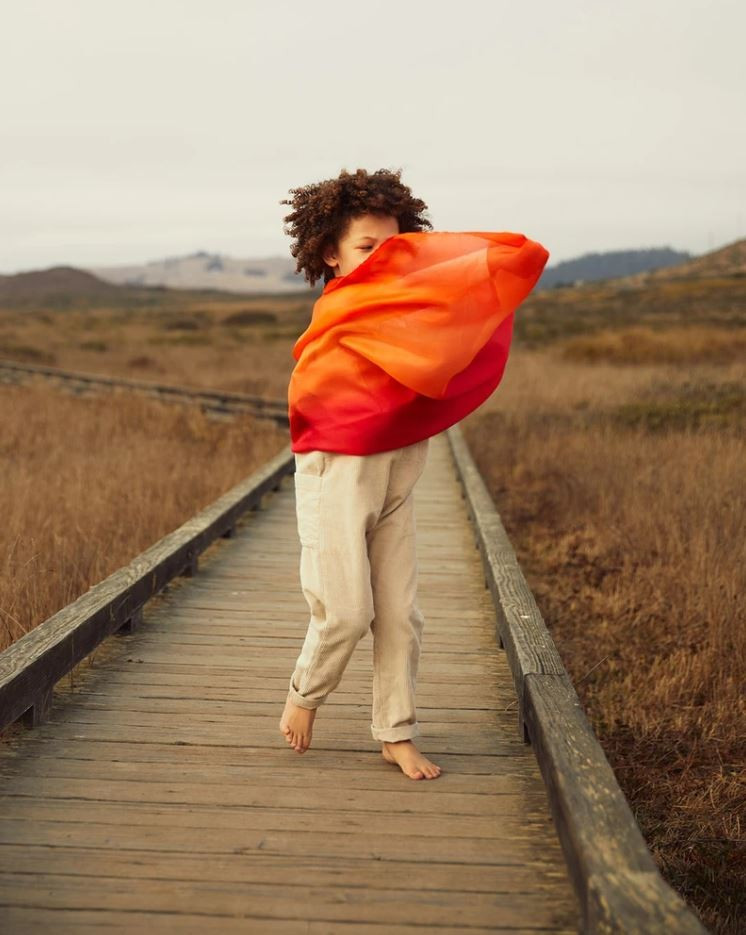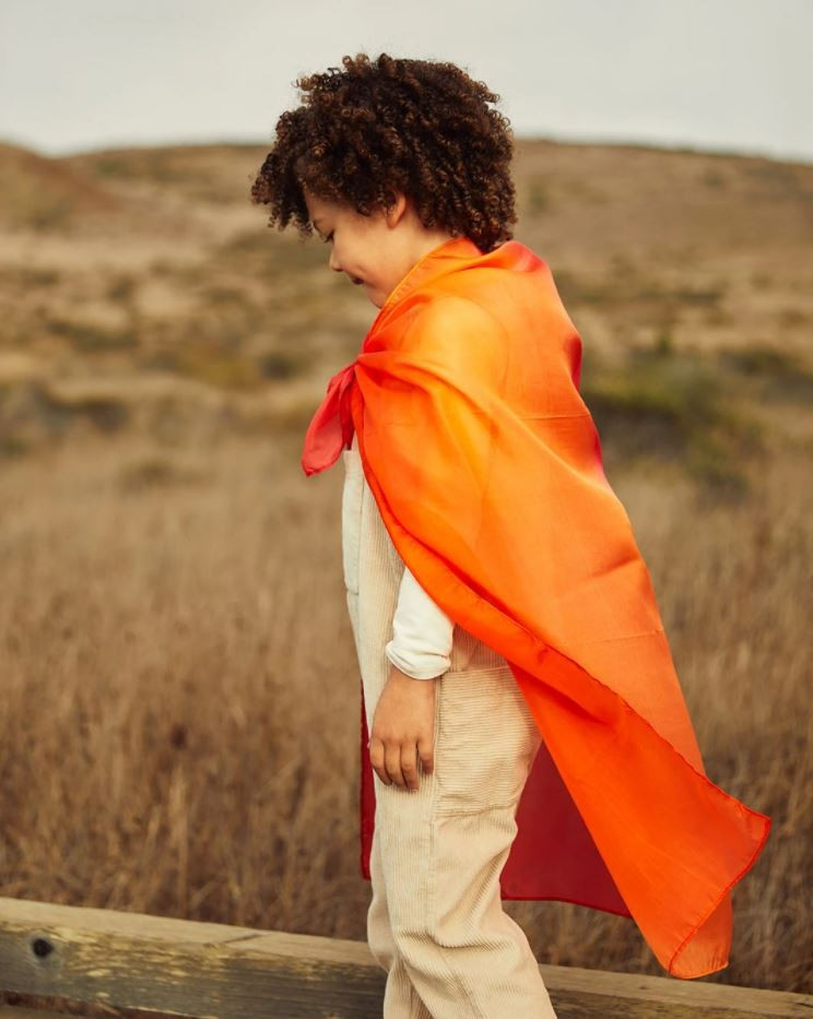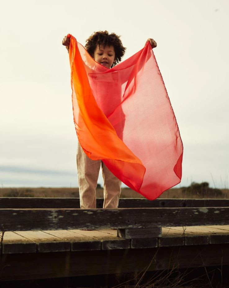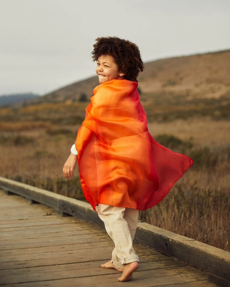 A finom selyem magas minőségű, Kínából származik, szépséges színátmeneteit Kaliforniában, kézzel színezik. Remek szórakozás a gyermekeknek, elővehetik öltöztetős játékhoz, erőd építéshez, babákkal való játszáshoz, szerepjátékhoz és annyi minden máshoz! A család többi tagja is szeretni fogja, például egy szép kendőként vagy terítőként.