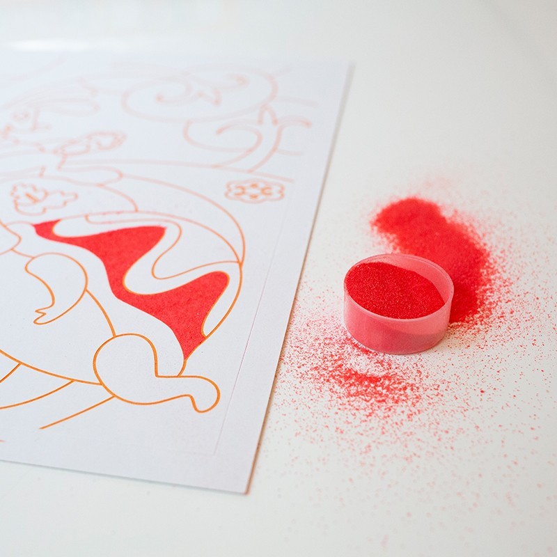 Minden kép egy rajzból áll, ami egy előre kivágott fóliával letakarható. A gyermekek lehúzzák a fóliát, hogy az alul lévő enyvezett alap felszínre kerüljön. Erre az alapra szórják aztán a különböző színű finom homokot, ami azonnal hozzáragad, és teljesen befedi az enyvezett felületet, szép, intenzív színű részletekből álló, gazdag rajzolatú, finom képeket hozva létre.