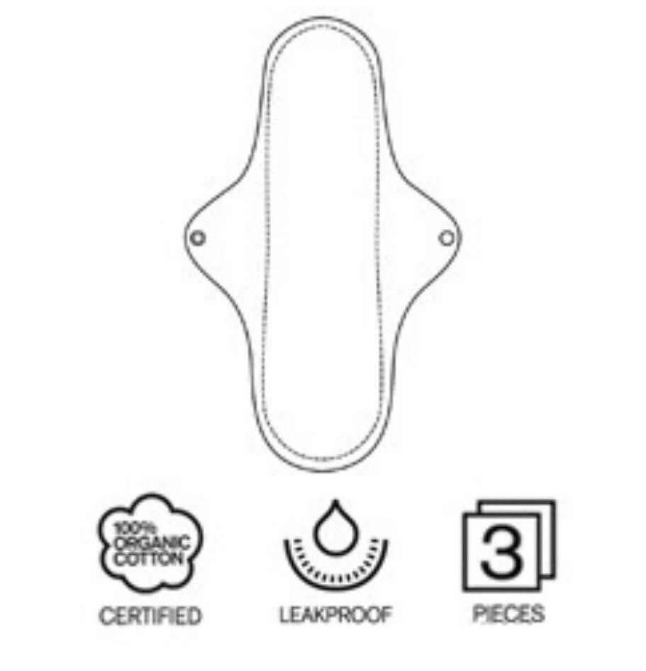 A menstruációs betét a szárnyakon lévő patentokkal záródik. A betétek anyaga 100% biopamut, így a puha anyag miatt kellemes viseletet biztosít ezeken a napokon. A betétek a megfelelő komfortérzet és a szivárgásmentesség érdekében PUL vízhatlan, légáteresztő réteggel vannak ellátva. A mosható betétek használatával nemcsak a saját komfortérzetedért, hanem a környezetedért is sokat tehetsz, az egyszer használatos műanyag termékek helyett válaszd a többször felhasználható, mosható alternatívákat.