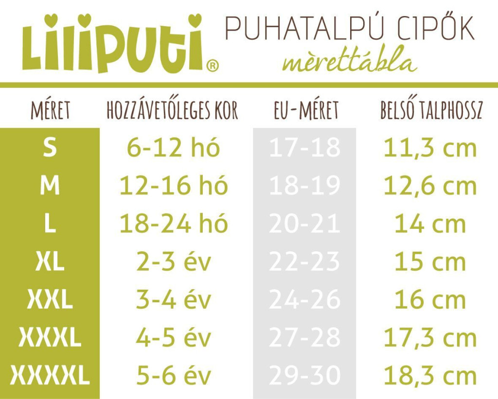 A gyerekek lába nagyon gyorsan nő totyogós korban. Egy év alatt akár 2 vagy 3 méretet is nőhet. A Liliputi cipők a normál cipőméreteknél nagyobb méret sávot ölelnek fel, ezért hosszabb ideig használhatóak. A Liliputi esetében az sem baj, ha vásárláskor egy picit nagyobb a cipő. Puhatalpú csizmáinkat S-es mérettől XXL-ig gyártjuk, ami kb. 6 hónapos kortól, 3-4 éves korig jó lehet. Vásárlás előtt mindenképpen mérd le otthon a gyermek lábát, így nem lesz probléma, hogy megtaláld a megfelelő méretet.