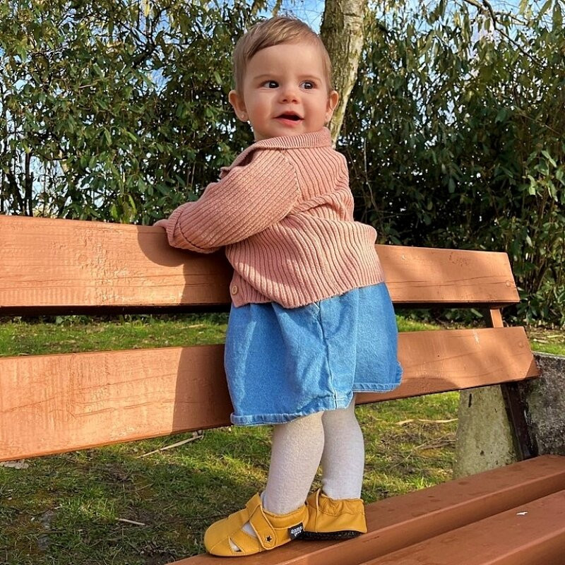 Kétféle külső talppal készülnek: a klasszikus bőrtalpas modellek puha, bababarát nappa bőrből, míg a tappancsos változatok csúszásmentes, légáteresztő talppal rendelkeznek, amely növeli a biztonságot csúszós felületeken. Mindkét változat tökéletes benti és száraz kültéri használatra, a különbség elsősorban a kopásállóságban és csúszásmentességben mutatkozik meg.