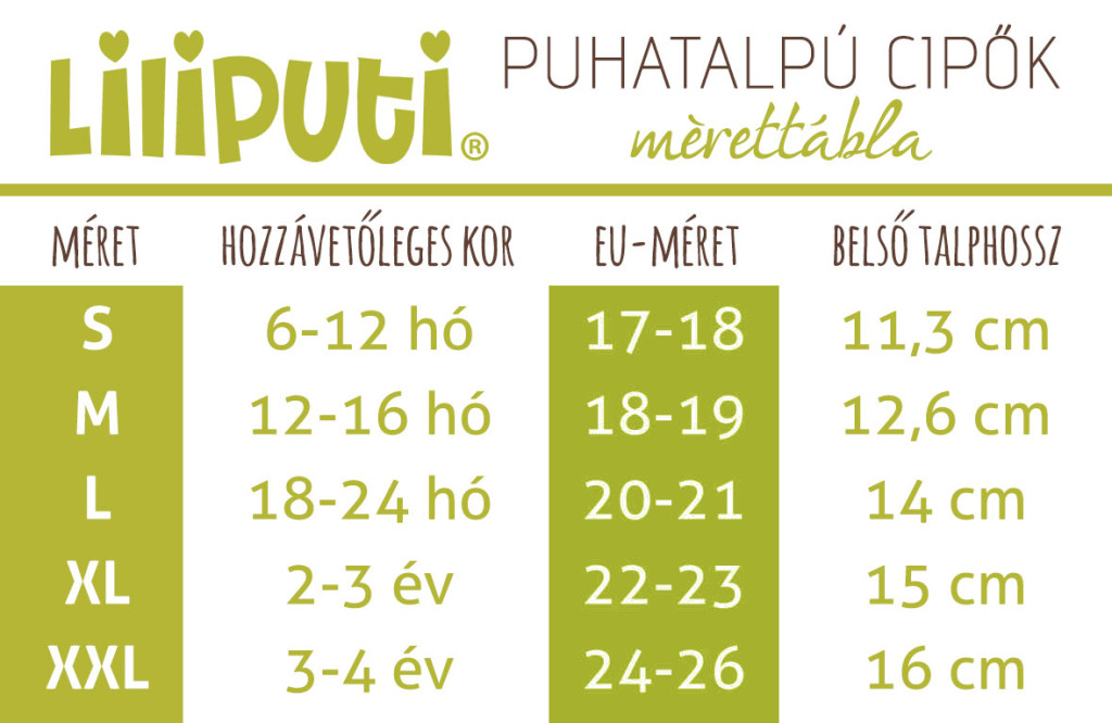 A gyerekek lába nagyon gyorsan nő totyogós korban. Egy év alatt akár 2 vagy 3 méretet is nőhet. A Liliputi cipők a normál cipőméreteknél nagyobb méret sávot ölelnek fel, ezért hosszabb ideig használhatóak. A Liliputi esetében az sem baj, ha vásárláskor egy picit nagyobb a cipő. Puhatalpú csizmáinkat S-es mérettől XXL-ig gyártjuk, ami kb. 6 hónapos kortól, 3-4 éves korig jó lehet. Vásárlás előtt mindenképpen mérd le otthon a gyermek lábát, így nem lesz probléma, hogy megtaláld a megfelelő méretet.