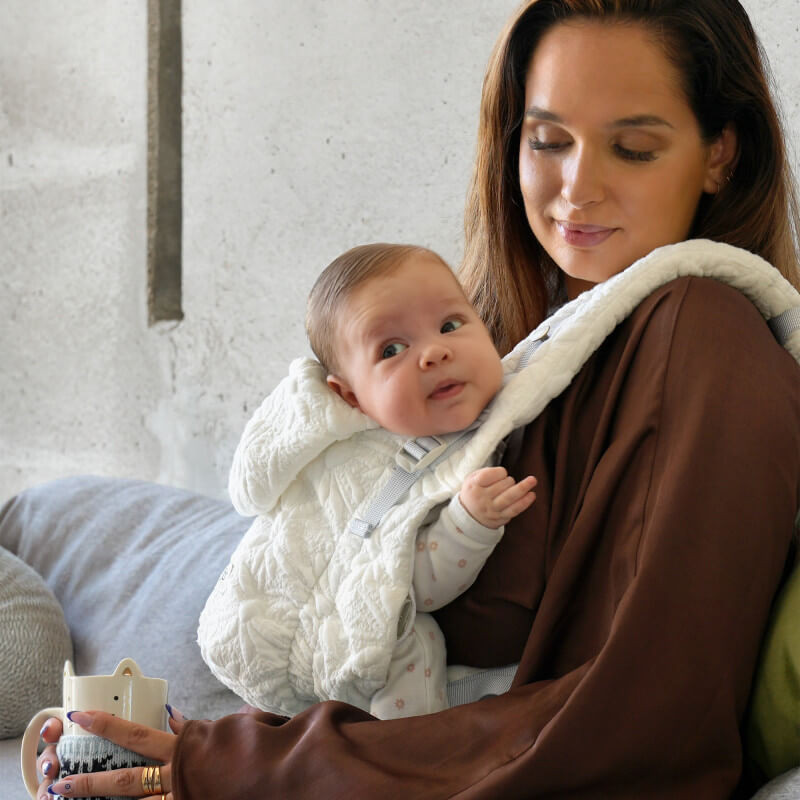 A derék- és vállpántok vastag párnázása kiemelkedő komfortérzetet biztosít a szülők számára is, még hosszabb hordozás során is tehermentesíti a hátat és a vállakat. Az innovatív dupla rétegű kapucni védi a babát a széltől és a napfénytől. Az átlátszó, légáteresztő hálós rész finoman megtartja a baba fejét, amikor elalszik, anélkül, hogy korlátozná a mozgásban.