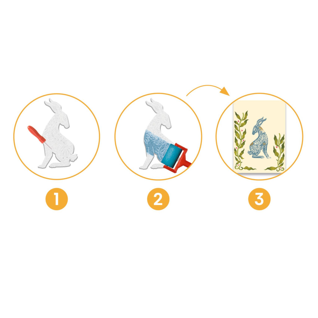 Bevezető gravírozási feladat kezdőknek. A mellékelt eszközzel a gyerekek különböző vonalakat, pontokat és formákat vájhatnak a polisztirol lap elemeibe. Az elkészült bélyegzőkkel, a festőhenger és festék segítségével színes mintákat, nyomatokat készíthetnek tetszés szerint dekorálva a kártyákat. A kész munkákat öntapadós motívumokkal, fémes díszítéssel lehet még tökéletesebbé tenni.