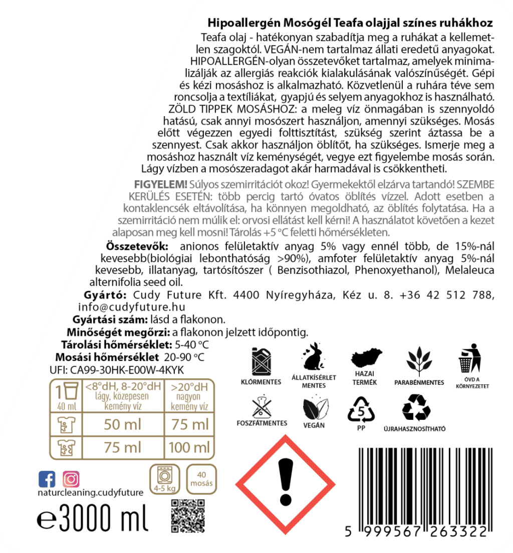Gazdaságosan adagolható mert 75 ml mosógél elegendő 4-5 kg átlagos szennyezettségű száraz ruha mosáshoz. A helyes adagolás kiválasztásához, kérjük, olvassa el a címkén található útmutatót. Az adagolást befolyásolja a mosáshoz használt víz keménysége (érdeklődjön a helyi ivóvízszolgáltatónál), a ruha szennyezettsége, a mosási hőfok. Minél lágyabb a mosóvíz, annál kevesebb mosószerre van szükség. Erősen szennyezett ruhaneműknél alkalmazzon folttisztítást, előáztatást. A Naturcleaning Teafa-Aloe hipoallergén mosógél közvetlenül a ruhára téve sem roncsolja a textíliákat.