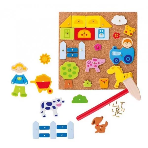 A GOKI Parafába kalapálj! játéksorozatában a 52 darabos farm készlet kiváló szórakozást nyújt. Csak egy jó kalapács kell hozzá és némi képzelőerő, és máris kész a saját várad , ami garantáltan nem hasonlít senki máséra!