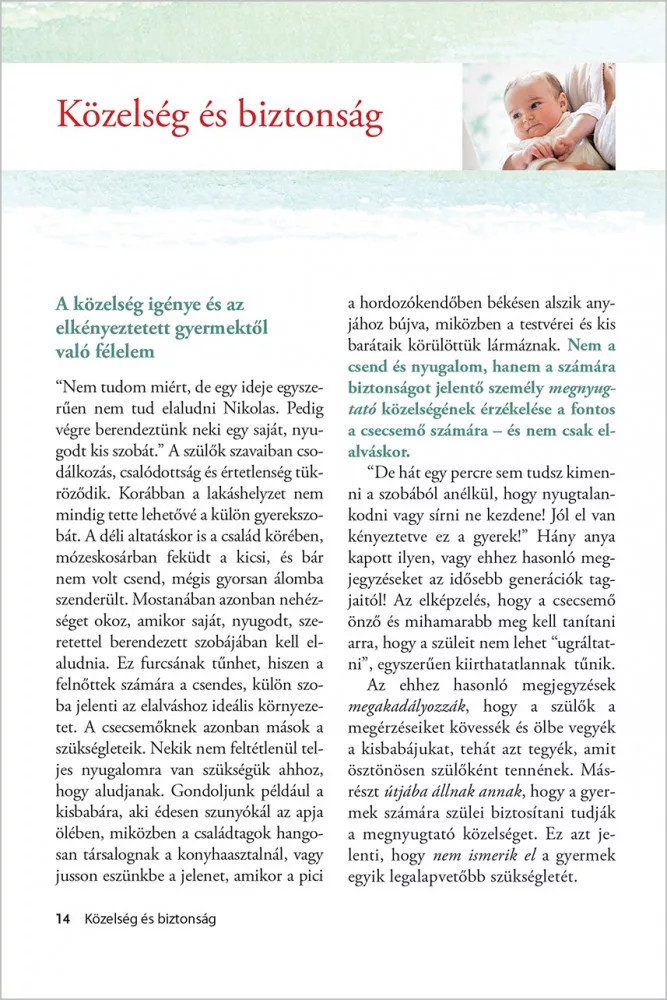 A könyv nagyon érthető módon ad választ olyan alapkérdésekre, amelyek általában elbizonytalanítják a szülőket, vegyék-e fel a gyermeket, ha sír, elkényeztetjük-e ha hordozzuk, miért is alapvető igénye a babáknak a testközelség, antropológiailag, milyen pozícióban jó ha hordozzuk. Kutatásokat ismertet, és valóban a tudással elveszi a kételyeket.