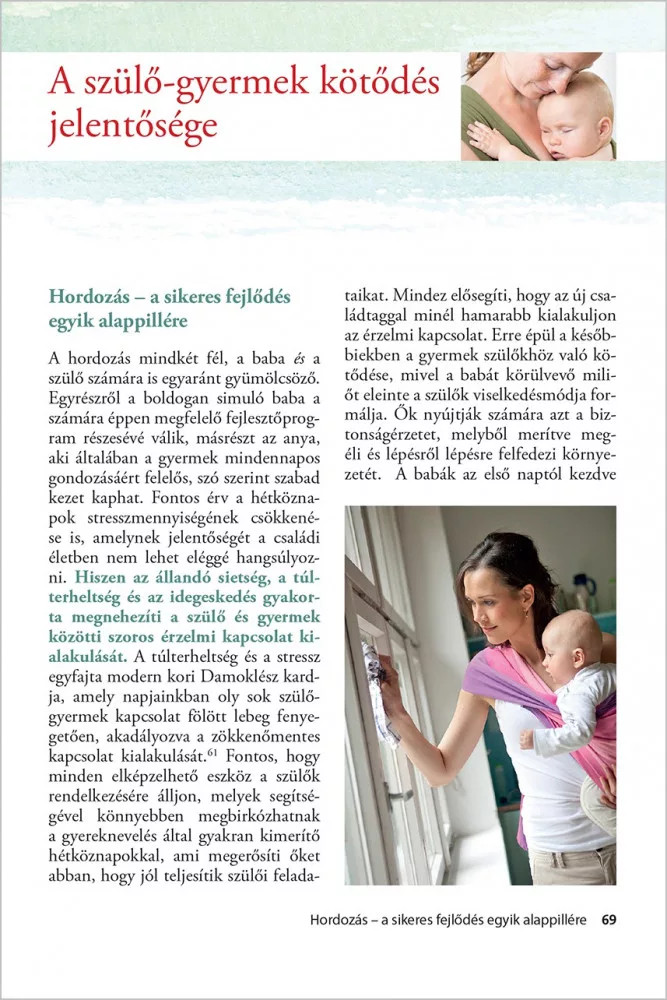 Aki úgy dönt, hogy vállalja a páratlan értékek hozamával járó babahordozást, annak sem a könyvtárából, sem a tudásának tárából nem hiányozhat ez a könyv. Boldogságos felhasználást kívánok minden kedves anyukának, apukának, szülőnek, gyermekszerető nevelőnek!" - Prof.Dr. Bagdy Emőke